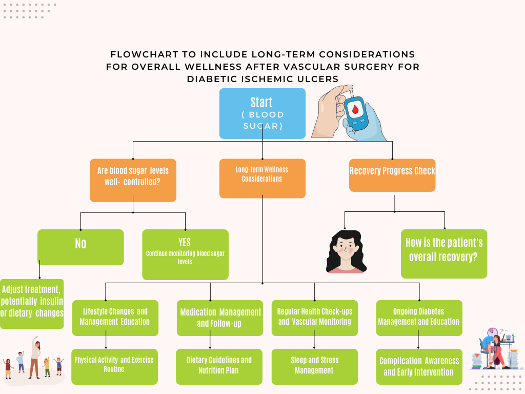 A: After surgery, patients typically stay in the hospital for a bit to make sure everything’s going well. The doctors check blood sugar levels, how the wound is healing, and overall recovery progress. Common surgical procedures for treating diabetic ischemic ulcers include debridement to remove dead tissue, bypass surgery to improve blood flow, angioplasty and stenting to open blocked arteries, and, in severe cases, amputation. The choice of surgery depends on the individual’s condition, the extent of the ulcer, and overall health.